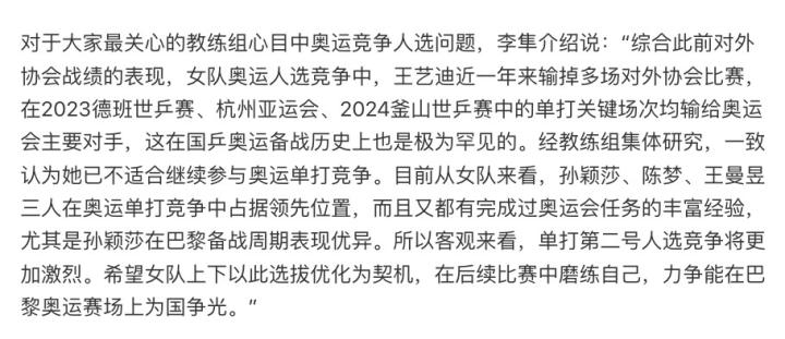 每个协会在奥运乒乓球单打最多派出两位球员,在孙颖莎早早锁定一个席位的情况下,另一个名额的悬念直到最后才揭晓。王艺迪第一个掉队,她在去年亚运的提前出局让自己背负很大压力,之后又屡次输给日本选手——要知道,日本女乒是中国队在大赛的主要对手。连败于早田希娜、被平野美宇零封、又输给15岁的张本美和,国乒甚至因此(或许不是全部原因,但至少是主要原因)修改了奥运名额的选拔规则。主教练李隼公开表示王艺迪不适合出战奥运女单,这种方式对于运动员来说绝对是非常大的打击。