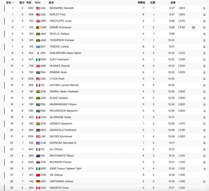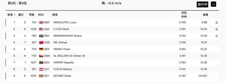 谢震业与美国选手、现世界排名第一诺亚-莱尔斯在第一轮中同处于第三组。谢震业跑出10秒16排名第四,诺亚-莱尔斯排名第二。