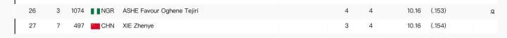 最终谢震业以10秒154的成绩,落后尼日利亚选手10秒153成绩千分之一秒,在除小组前三外的选手中未能跻身前三,无缘100米半决赛。