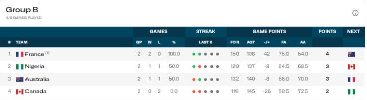 目前B组的形势相对较为复杂。法国2胜0负排名榜首,尼日利亚和澳大利亚均1胜1负且净胜分均为-8,加拿大2战全负。末轮尼日利亚对阵加拿大,澳大利亚对阵法国。