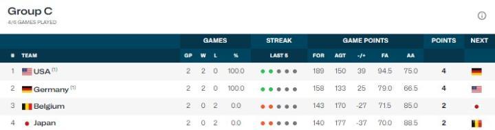 而C组的形势和中国女篮所处的A组相似,德国和美国均以2胜0负的战绩锁定晋级资格,比利时和日本均0胜2负。比利时净胜分-27,日本净胜分-37。