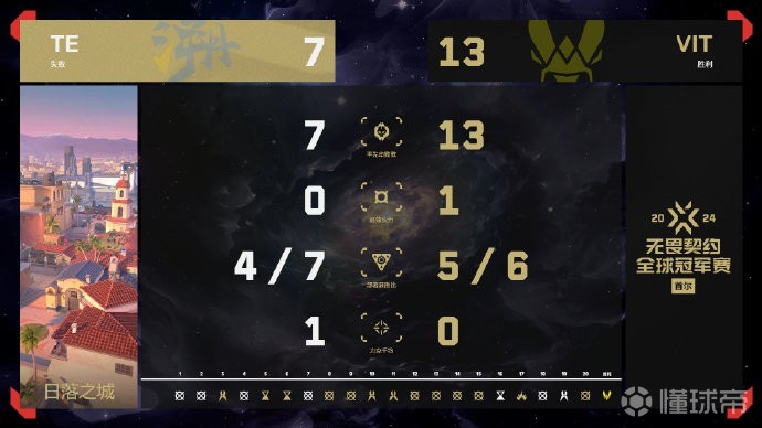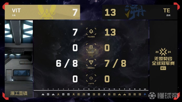 下半场VIT赢下手枪局,小蜜蜂在控图上做足文章,TE频频丢失超市与中路控制权,无法化解对手的进攻战术,最终VIT 13-7赢下图二。