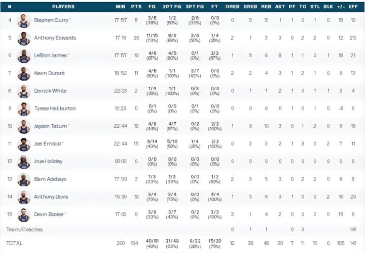 美国男篮安东尼-爱德华兹26分3板3助2断,恩比德15分3板2助2帽,杜兰特11分4板3助1断。