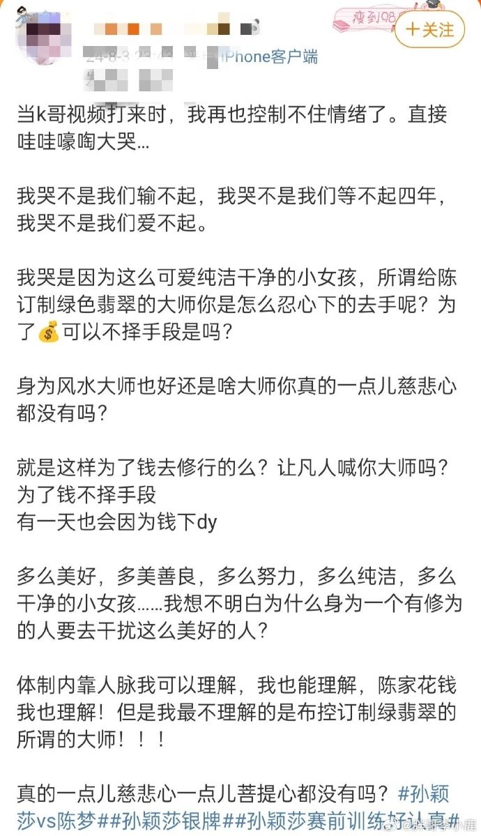 这???陈梦戴翡翠比赛,有网友称这是找“大师”布控风水阵 今日迷惑行为 今日迷惑行为2024-08-04 12:32巴黎奥运会乒乓球女单决赛,陈梦以4-2击败孙颖莎成功卫冕。陈梦在本届比赛时会佩戴一条翡翠项链,在昨晚她夺冠后有部分网友猜测称,陈梦家族和她的表哥黄晓明找“风水大师”用翡翠布控风水阵,以此来“克住”对手。展开更多