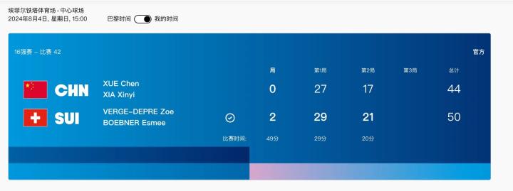 北京时间8月4日,巴黎奥运会女子沙滩排球16强赛中,中国组合薛晨/夏欣怡以0-2比分负于瑞士组合佐伊-韦尔德普雷/艾斯米-博埃内尔被淘汰出局。中国组合也以1胜3负的战绩结束了本届奥运。首局中国组合一度与对手战至27平,但最终遭遇逆转遗憾失掉首盘比赛。