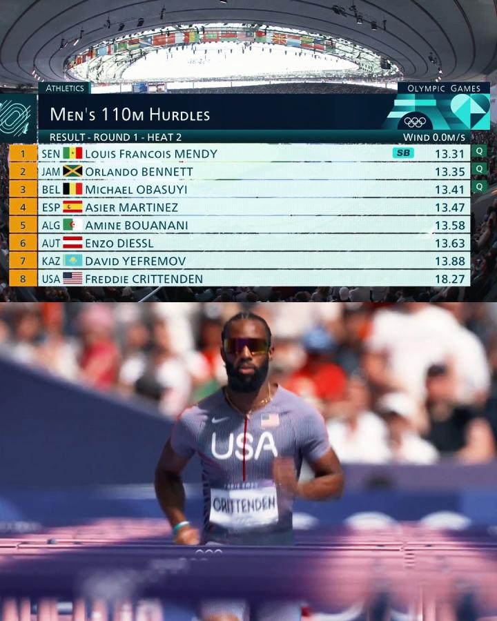巴黎奥运会男子110米栏第1轮,美国选手弗雷迪-克里滕登跑出了18.27的成绩,小组垫底进入复活赛。