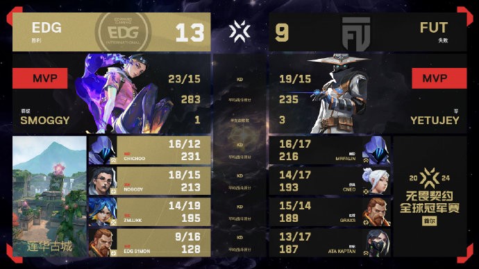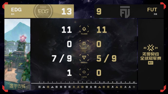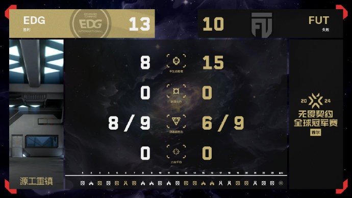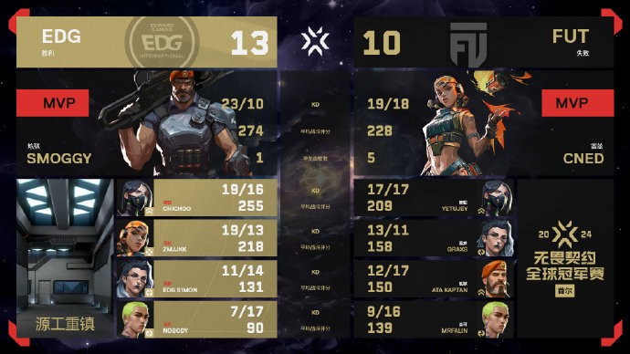 下半场FUT终于赢下手枪局,一口气连下4分追平比分,EDG陷入被动局面。第17回合,EDG开局掉人,后续依靠球球的个人能力以及s1mon的残局拿分。第22回合,FUT集合进攻B区,道具覆盖非常完美,好在EDG回防及时,smoggy包点三杀!12-10拿下赛点。第23回合,EDG全员发挥,13-10带走比赛!
