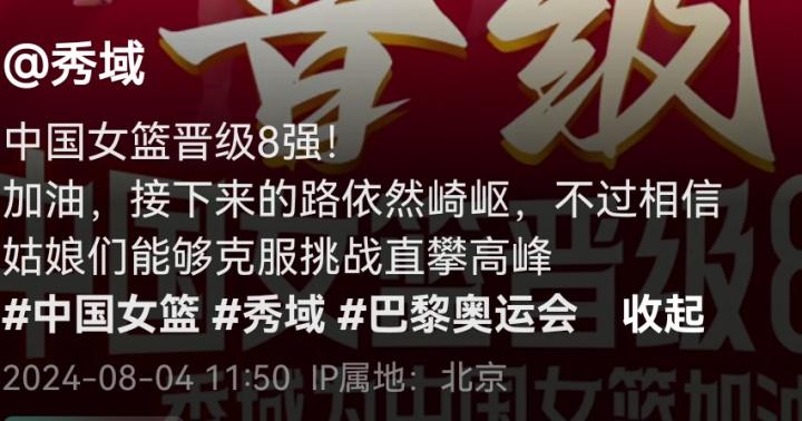 秀域配文:“中国女篮晋级8强!加油,接下来的路依然崎岖,不过相信姑娘们能够克服挑战直攀高峰。”