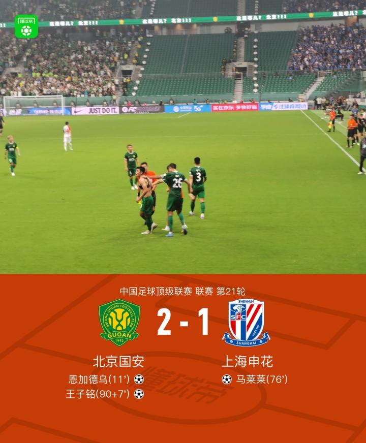 北京时间8月4日,中国足球顶级联赛第21轮比赛中,北京国安主场迎战上海申花。比赛第11分钟,古加角球助攻,恩加德乌头球得分,第76分钟,阿马杜下底传中,马莱莱不停球直接得分扳平,补时第7分钟,张稀哲送助攻,王子铭独闯龙潭打进绝杀球。最终,北京国安2比1终结上海申花开季不败纪录。