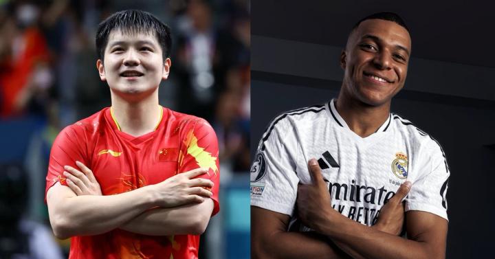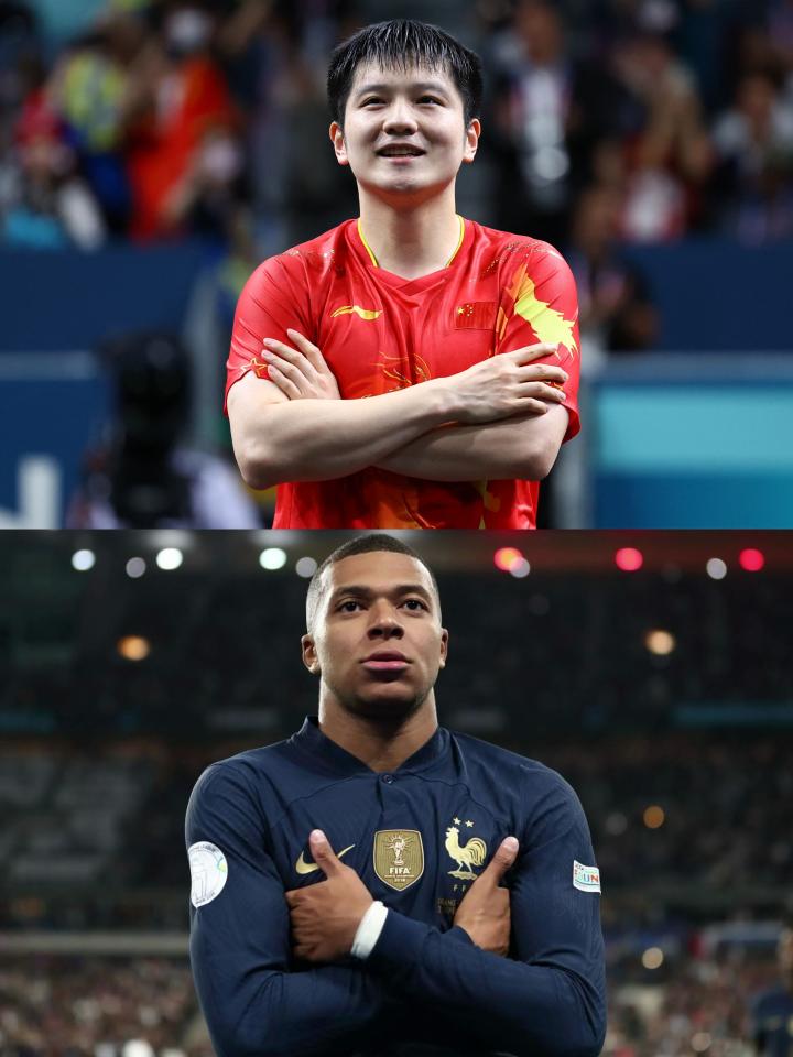 而在男单决赛夺冠后,樊振东则模仿了今夏加盟皇马的姆巴佩的标志性动作,将双手交叉放在胸前。