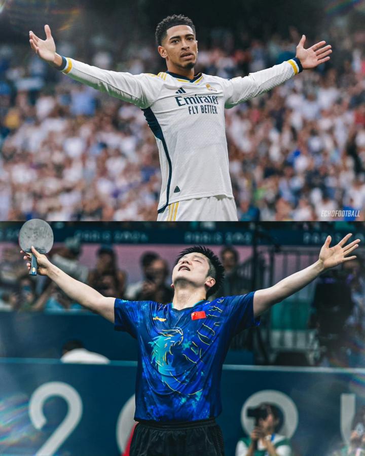 巴黎奥运会乒乓球男单1/4决赛,樊振东在4-3逆转击败日本选手张本智和后,做出了皇马球星贝林厄姆的同款庆祝动作,张开双臂。