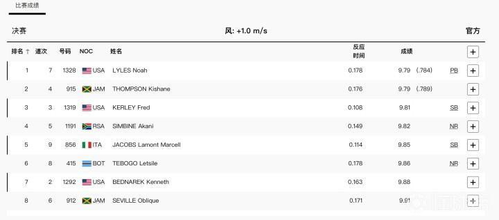 发令枪响,比赛开始!8人争夺十分激烈,几乎同时撞线,第一和第八只差0.12秒,而莱尔斯和汤普森同为9.79秒!最后莱尔斯决胜千分位,以9.784秒夺冠,而汤普森9.789秒,只落后千分之五秒屈居亚军!