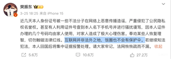樊振东、王楚钦因不堪极端粉丝的骚扰、跟拍,曾多次在社交媒体上发声:“互联网不是法外之地”、“希望大家能尊重彼此的隐私”。