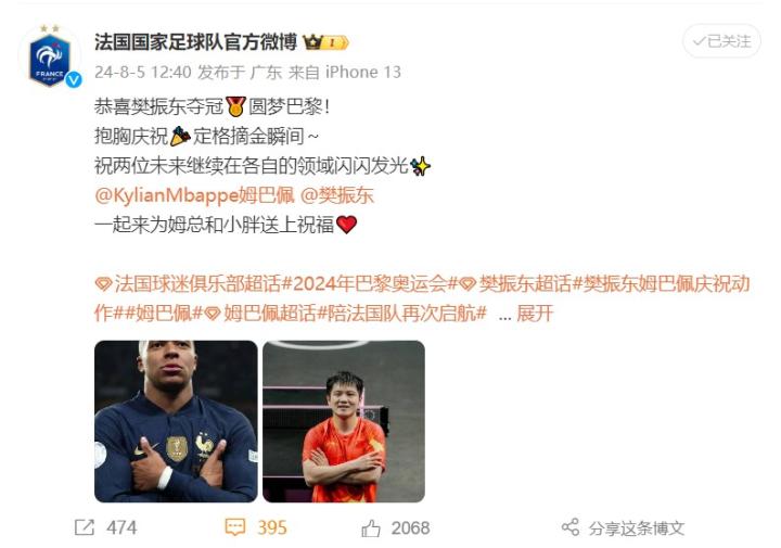 今日中午,法国国家队官方更新社媒向樊振东送上祝贺:恭喜樊振东夺冠圆梦巴黎!抱胸庆祝定格摘金瞬间~祝两位未来继续在各自的领域闪闪发光,一起来为姆总和小胖送上祝福!