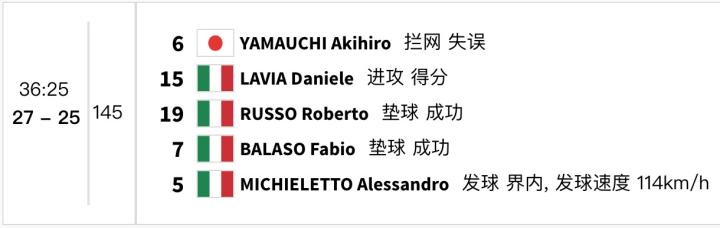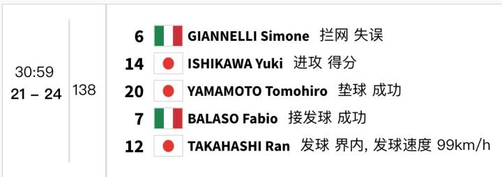 前两局,意大利男排20-25、23-25连丢两局,大比分0-2落后。第3局,意大利队21-24落后,日本队拿到了三个赛点。随后,意大利队连救三个赛点,并以27-25拿下第三局!