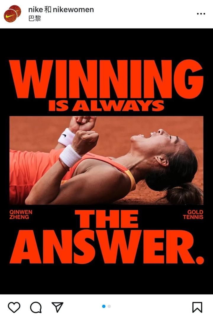 虽然郑钦文穿了耐克的球鞋,但碍于在比赛中个人的赞助地位最低,耐克这边只能另辟蹊径进行宣传。所以在比赛结束后,耐克官方在社媒庆祝郑钦文夺金时,还专门精选出一张看不到竞争对手的Logo,且其带上自家护腕的照片。
