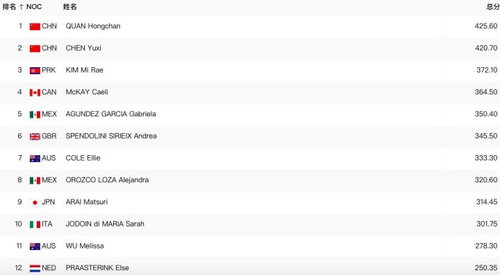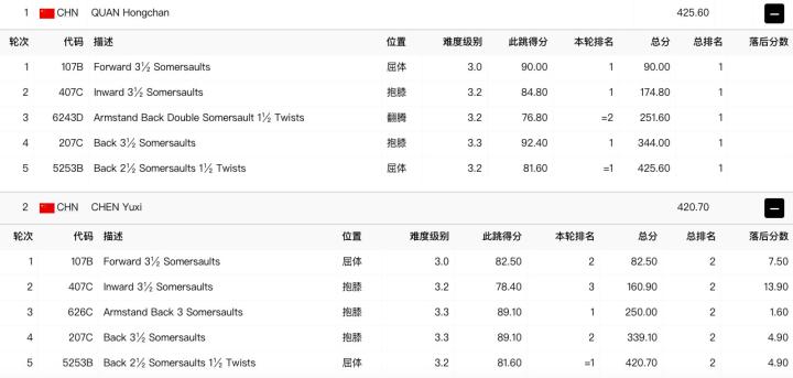第五跳,全红婵5253B跳出81.60分,总分425.60夺冠,陈芋汐5253B跳出81.60分,总分420.70拿到银牌。
