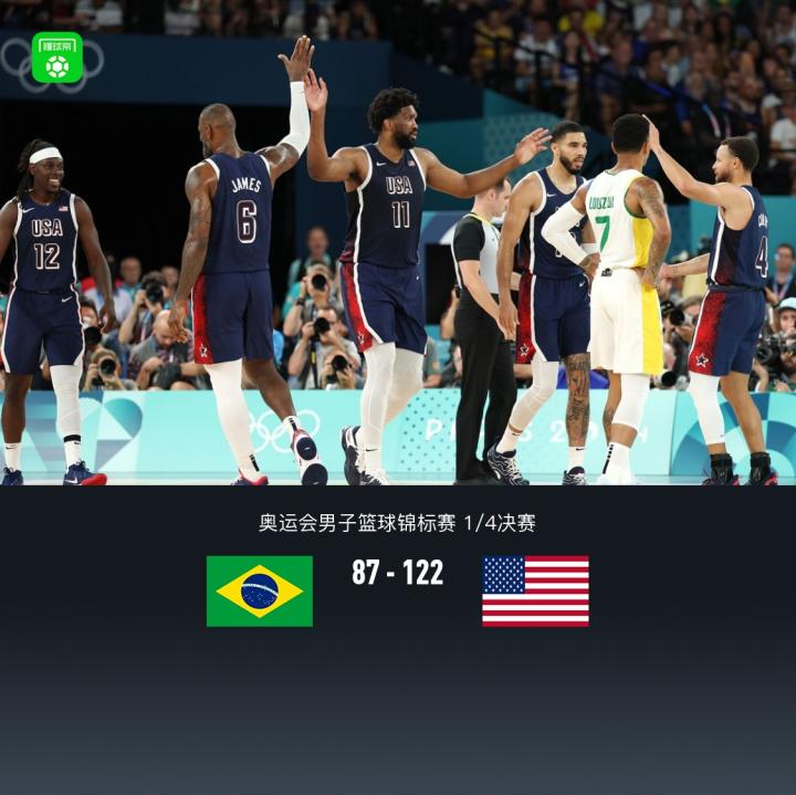 美国男篮122-87巴西晋级半决赛对阵塞尔维亚!詹姆斯12分9助
