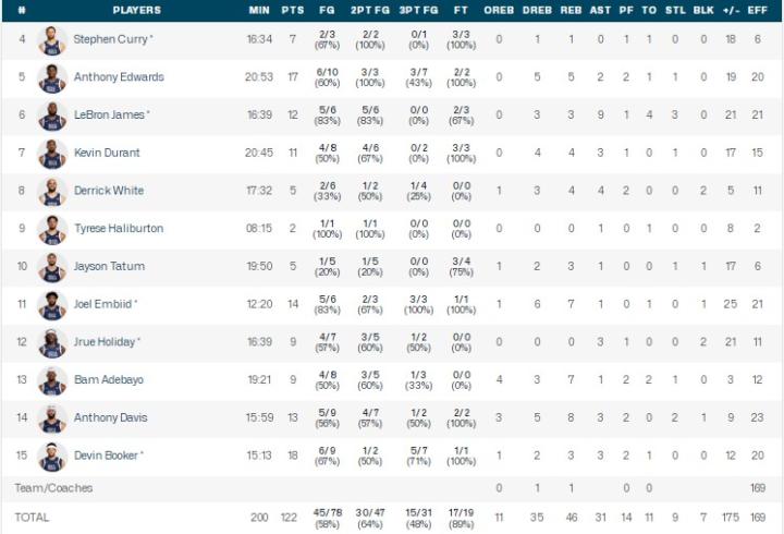 美国男篮德文-布克18分3板3助,安东尼-爱德华兹17分5板2助1断,恩比德14分7板1助1帽。