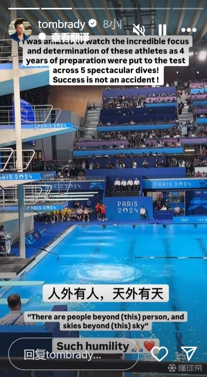 在这场比赛中,橄榄球传奇汤姆-布雷迪也亲临现场观战。他深深地被两名中国选手的高水平发挥所折服。在个人社交媒体上他晒出了两名选手的跳水时刻,并配文写道:“我很震惊地看到这些运动员令人难以置信的专注和决心,因为他们四年的备战在五次精彩的跳水动作中展现得淋漓尽致,成功不是偶然的!”