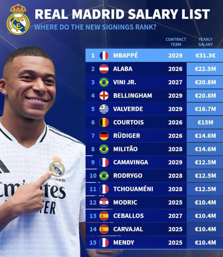 德转列皇马年薪榜:姆巴佩、阿拉巴、维尼修斯、贝林厄姆前四