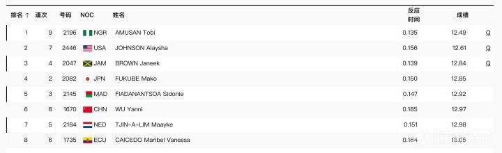 最终,吴艳妮跑出12秒97,在第一组中排名第六,将进入复活赛。