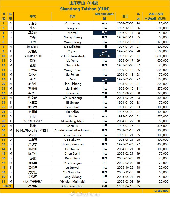 中超亚军山东泰山;