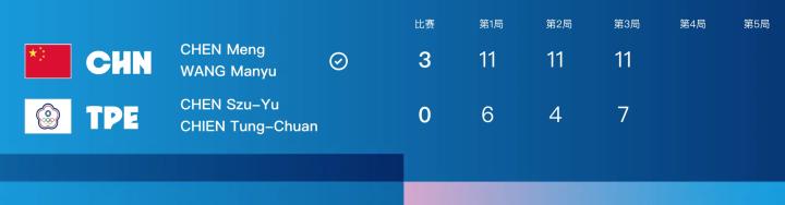 第一场,陈梦/王曼昱vs陈思羽/简彤娟。中国队双打组合发挥稳健,三局比赛都没有给对手太多机会,三局比分分别是11-6、11-4、11-7,中国队取得1-0领先!