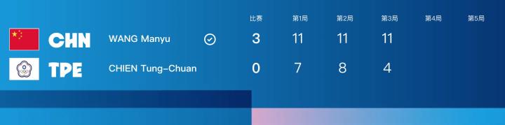 第三场,王曼昱vs简彤娟。王曼昱11-7拿下第一局,第二局进行得比较胶着,王曼昱在7-7后发力,11-8拿下第二局。第三局,王曼昱11-4火速拿下,中国队3-0战胜中国台北晋级四强!