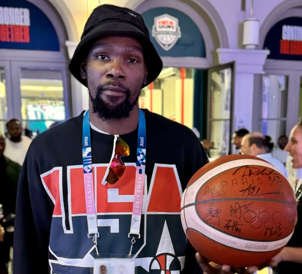 赛后,美国男篮全队队员在比赛用球上签下了自己的名字,将球送给了杜兰特,以示庆祝。