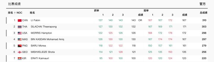 最终,李发彬以抓举143kg,挺举167kg,总成绩310kg夺得中国举重巴黎首金成功卫冕,并刷新了抓举的奥运会纪录。
