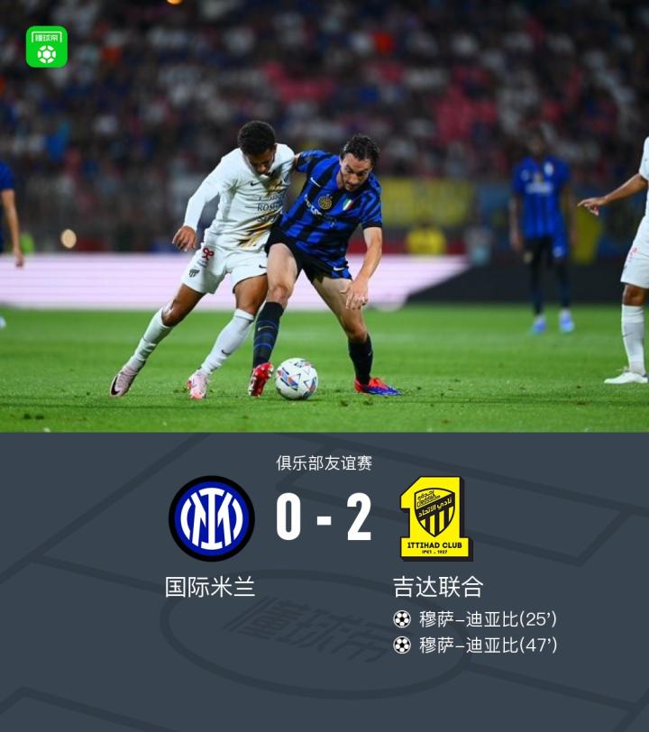 在一场俱乐部友谊赛中,国际米兰迎战吉达联合。上半场,奥亚尔直塞助攻迪亚比破门得分。随后,迪亚比横传,本泽马面对空门射偏。下半场,迪亚比补射再下一城。全场比赛结束,国米0-2不敌吉达联合。
