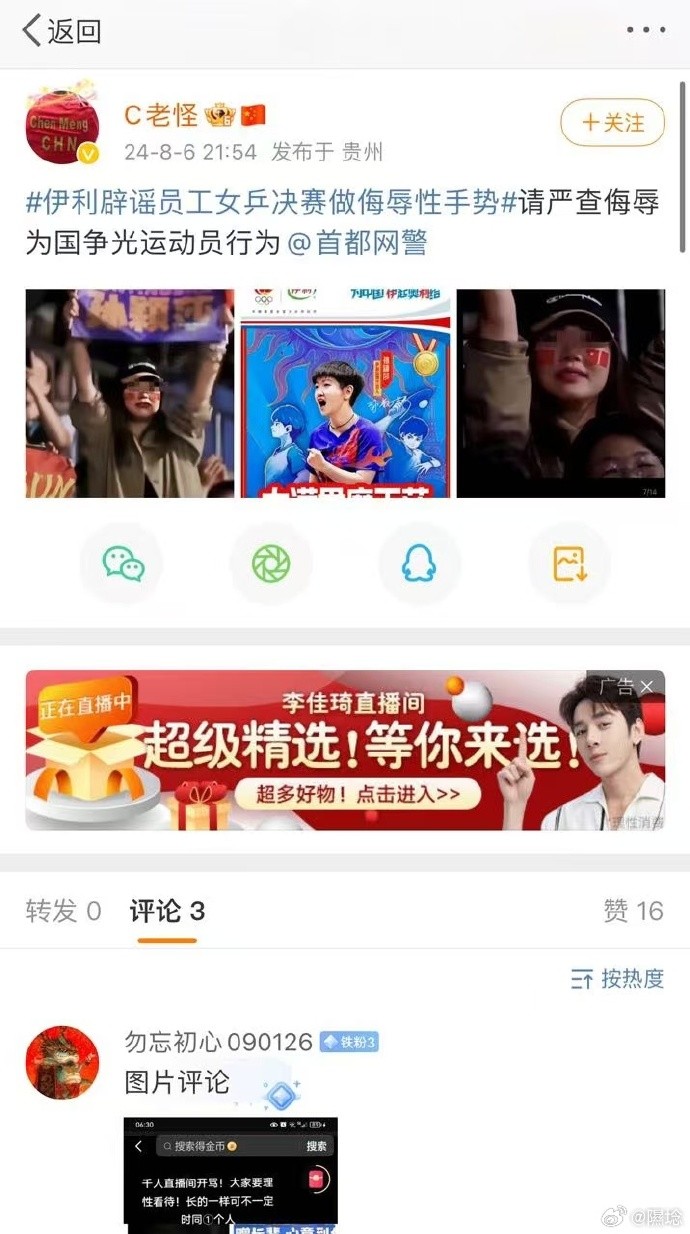 1、澄清:我的照片被各平台疯传进而网暴,且造谣者说我是“竖中指”女主,特此说明我不是该名现场观众。我于8.3日在巴黎南场馆观看乒乓球女单决赛,我本人支持所有中国运动员,在中国女乒已经锁定金银牌的前提下,我选择为刚刚为祖国赢回东奥丢掉的混双金牌的孙颖莎加油。因此当天我从孙颖莎球迷手里领取了国旗和孙颖莎手幅准备为中国队、为孙颖莎加油。在比赛过程中,我从未有过竖中指等任何不文明的行为,最多是看到好球时起身为孙颖莎鼓掌举横幅,不知为何被冠上这么罪恶的一顶帽子。