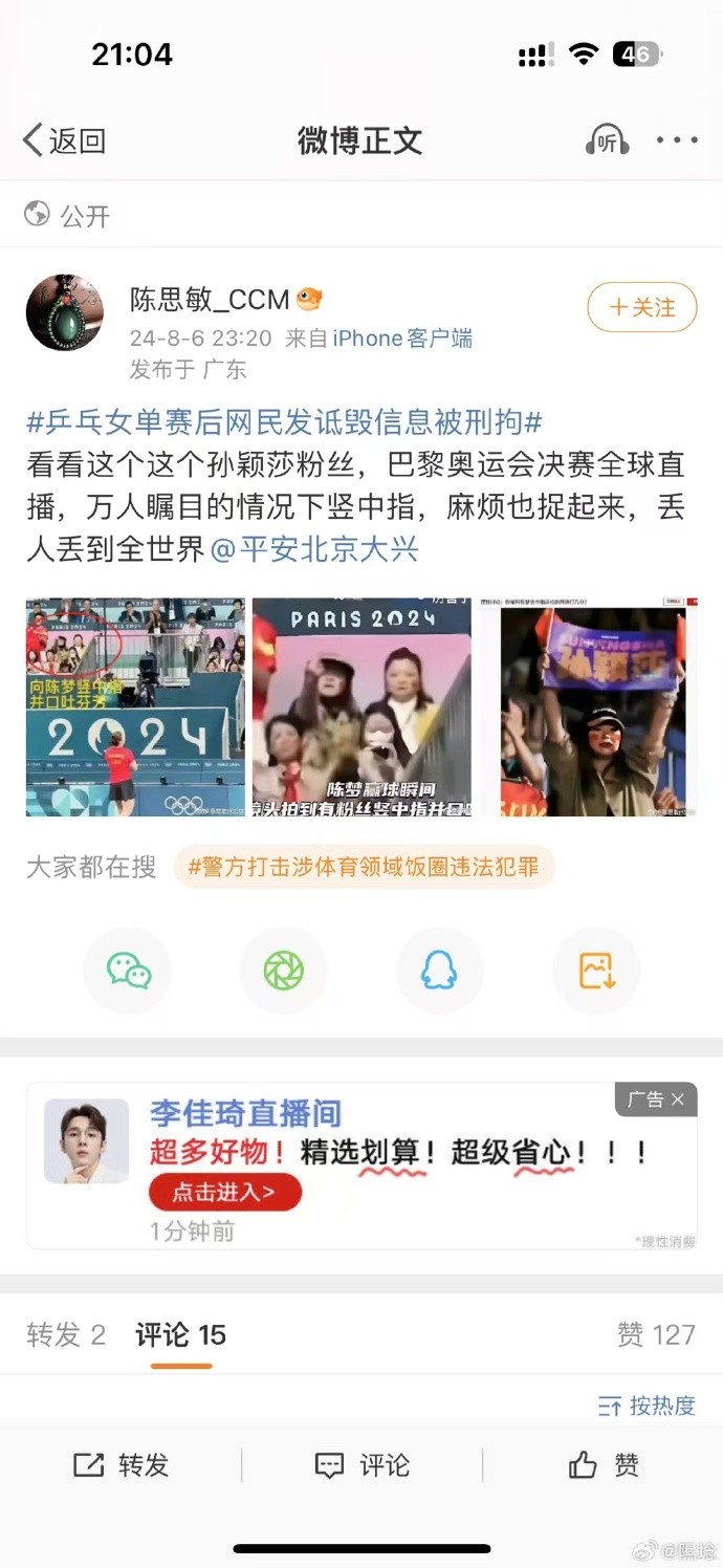 3、声明:我是个素人,也是个千里迢迢从祖国跑到巴黎支持中国乒乓球的普通观众。比赛过程中我未做任何出格的事,没想到,仅仅是为我国运动员起身鼓掌也要遭此莫须有的网暴。我会用法律手段保护自己,如有还在传播或准备传播我的照片的网友,请立即删除!否则,我会追责到底!
