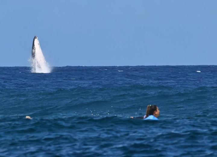 与鲸共舞,奥运冲浪比赛现场一头鲸鱼“参赛”