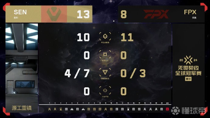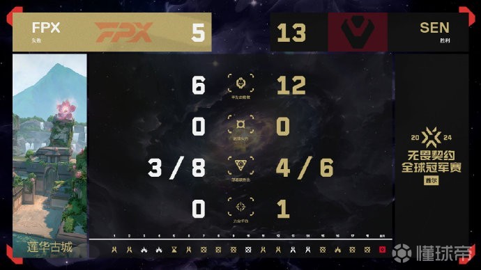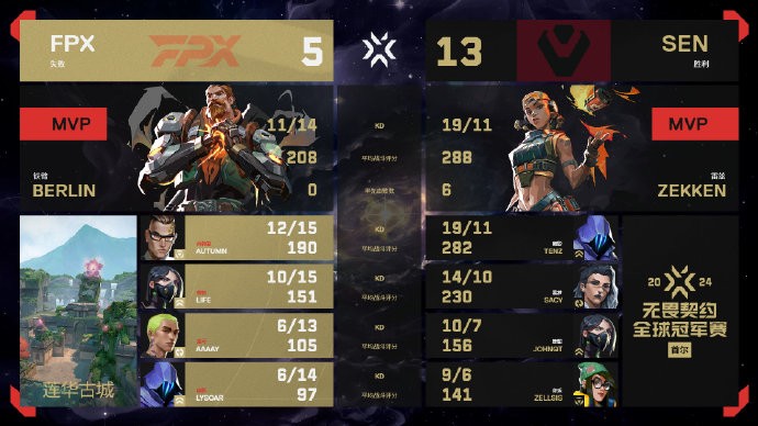 下半场FPX拿下了手枪局,比分追至5-9。第15回合,SEN奖励局打出1换5。此后FPX再无还手之力,5-13输掉图二。
