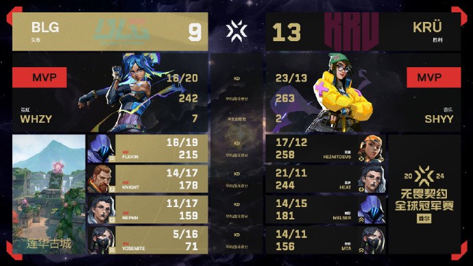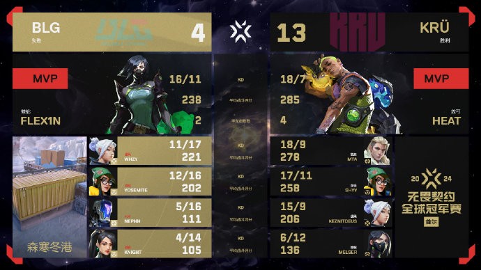 下半场KRU摧毁了BLG的手枪局,11-3。第15回合,BLG输掉奖励局,KRU 12-3拿到赛点。最终KRU 13-4战胜BLG。