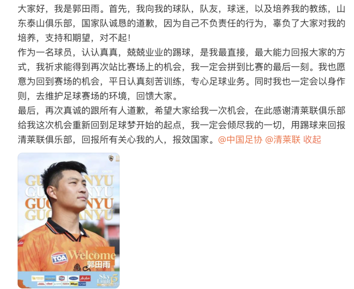 在清莱联官方宣布郭田雨加盟球队后,郭田雨发文向球迷、泰山、国家队诚恳道歉,希望大家给他一次机会。