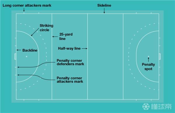 标准的曲棍球比赛场地,长91.4米,宽55米,略小于标准足球场。曲棍球的比赛场地同样包括中线和点球点,射门弧等同于足球场的禁区。但是有所不同的是,其一,只有在射门弧内完成的进球,才被视作有效得分;其二,在距离底线22.9米处各有一条额外的线(25码线),用于划分比赛场区。这条线将直接引出曲棍球的另一大独特之处:短角球。