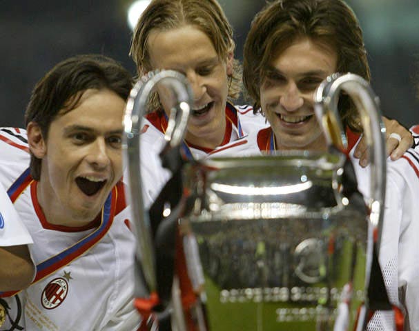 在雅典奥林匹克球场,AC米兰凭借因扎吉的两粒进球完美复仇!第7次捧起了欧冠冠军的奖杯!!