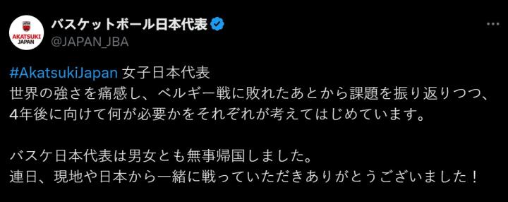“日本男子和女子国家篮球队都已安全回国。非常感谢球迷们在当地和日本与我们一起战斗!”