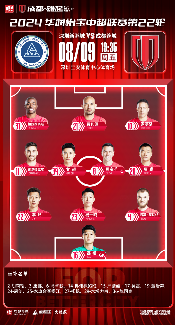 深圳新鹏城vs成都蓉城 比赛首发名单出炉!成都,雄起!