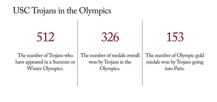根据南加大官方统计,南加州大学的奥运选手总计有512人参加了奥运会,在奥运会代表队中占据了711个席位,并获得了153枚金牌、96枚银牌和77枚铜牌(包括夏季奥运会和冬奥),共326枚奖牌。