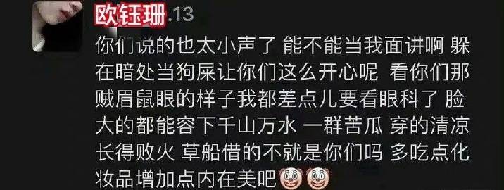 随后,欧钰珊在朋友圈进行反击,怼道:“我这么拉的人都进决赛了,罗欢怎么没进?”随后,她又继续发了多条内容回怼罗欢。
