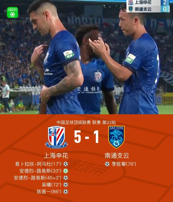 申花5-1南通,路易斯两射一传,阿马杜、陈晋一轰世界波