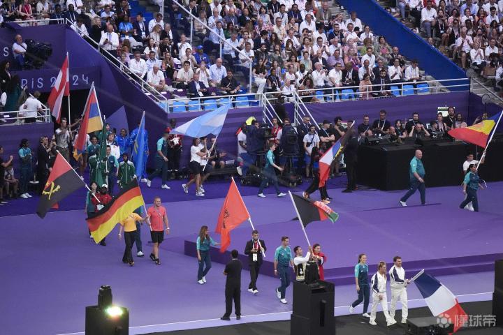 主角们来了!各国代表团旗手纷纷举起各自的国旗走进法兰西体育场,中国代表团的旗手是举重冠军李发彬和女子曲棍球队队长欧紫霞。