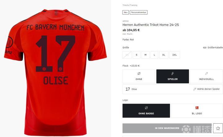 在拜仁的官方商城可以看到,现在奥利塞的球衣已经发售,号码为17号,球员版球衣加引号的售价为164.95欧元(约人民币1293.65元),球迷版的售价为114.95欧(约人民币901.51元)。