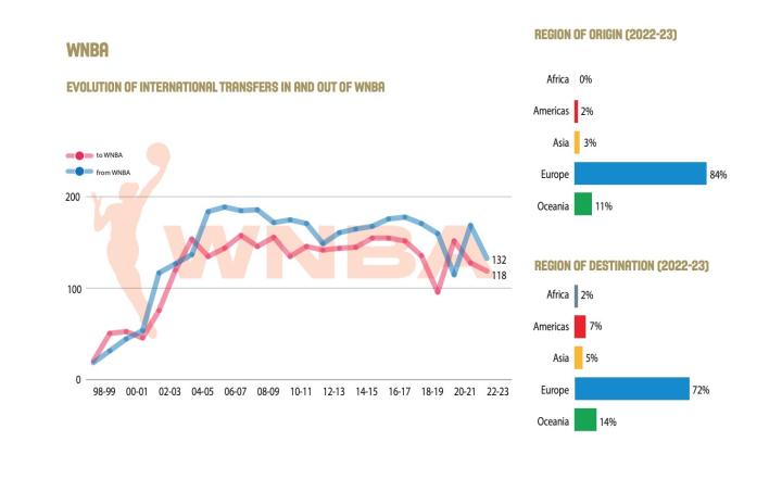 根据FIBA官方2023年的一份报告,进入21世纪以来,WNBA国际球员的流动迅速增加,2023年来自WNBA的球员“转会”多达132名,其中占大头的就是欧洲。
