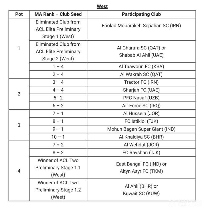 第一档:塞帕罕(伊朗)、加拉法体育(卡塔尔)/迪拜青年国民(阿联酋)、布赖代合作(沙特)、沃克拉(卡塔尔)