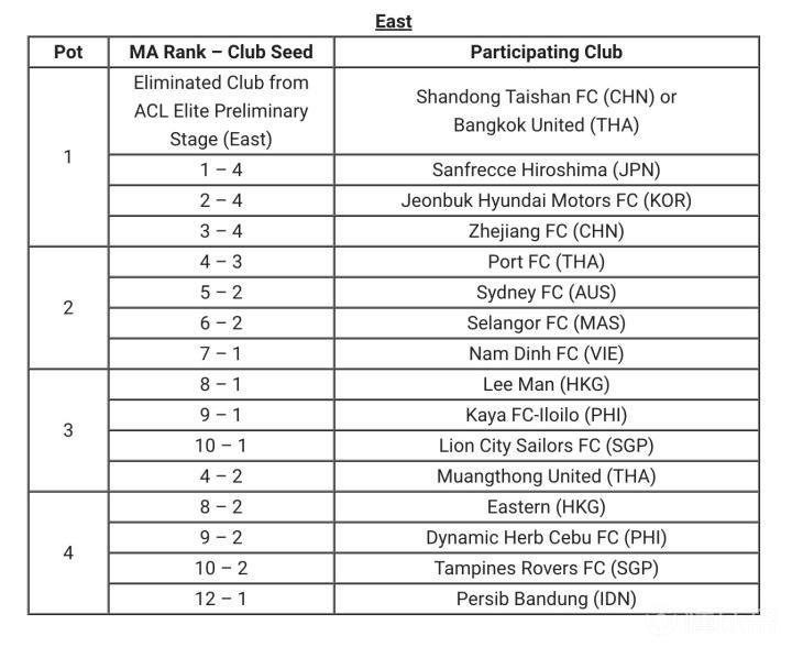 其中,浙江队位于东亚区一档,山东泰山若未能在亚冠精英赛中胜出也将位于一档。